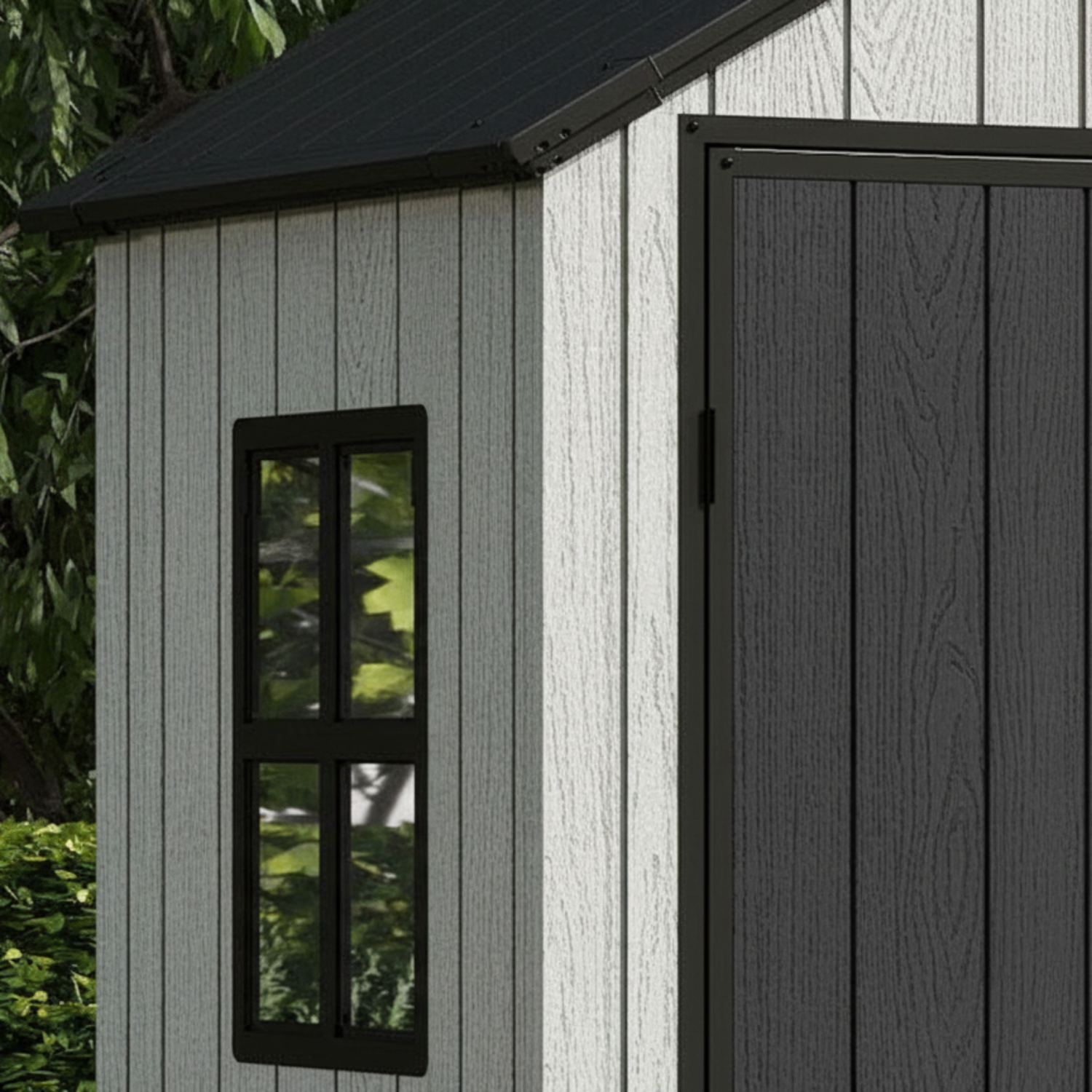 The 4x6 Pro Grade 'Wood-Touch' Shed is a great looking, practical & long lasting solution for your garden storage needs, combining the warmth and feel of natural wood with the practicality of weather-resistant plastic.
