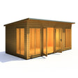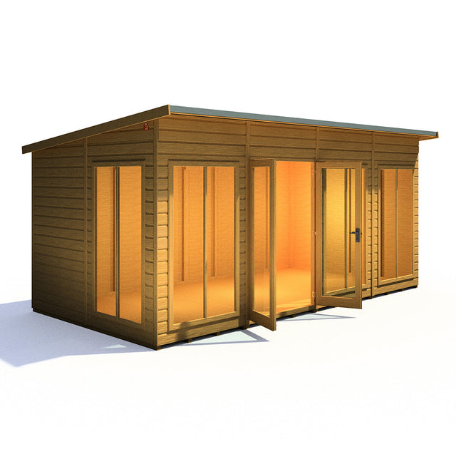 The stylish Lela Summerhouse is a valuable addition to your outdoor living - this modern garden room is perfect for summer dining and relaxing. With an eaves height of around 7 ft high, the Lela provides a very comfortable, spacious interior. The joinery made double doors are fitted with a mortice lock. The windows are fixed and all glazing is acrylic for your safety. The building is constructed on 34 mm square framing and clad with planed shiplap tongue and groove boards made only from the highest grade, FSC approved, slow grown pine. The floor and roof are 12mm matching T&G boards and the roof comes with mineral felt supplied. Dipped base coat preservative ready for you to top coat.